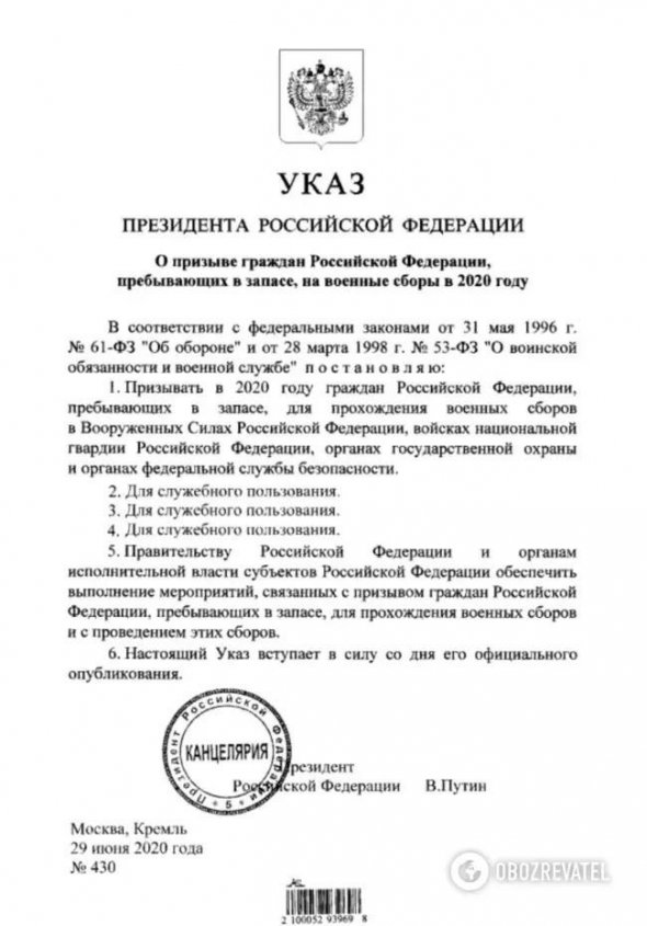 Перзидент Росії Володимир Путін підписав указ про призов військових росіян у запасі на збори 2020 року.