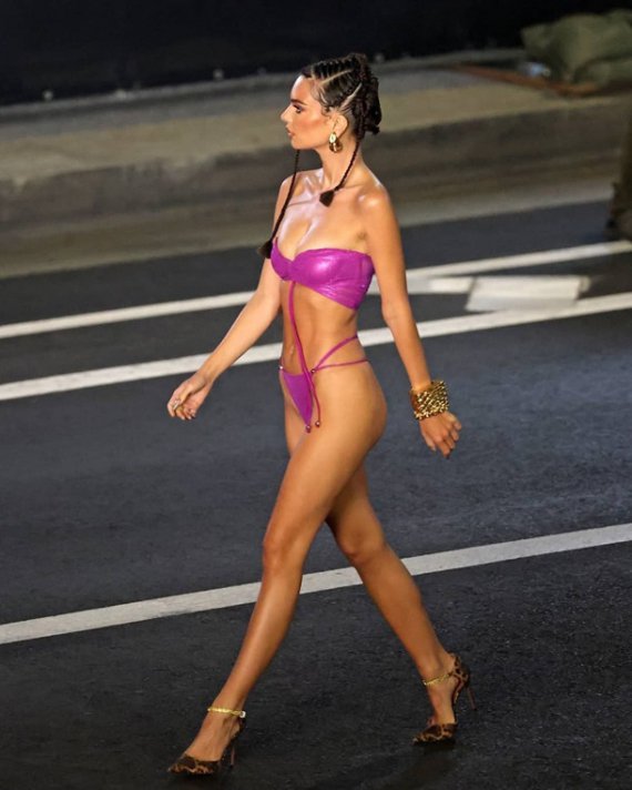 Ратаковскі дефілювала в роздільному купальнику яскраво-пурпурового відтінку і леопардових босоніжках на високих підборах. Ефектний образ доповнили золотисті прикраси, яскравий макіяж і незвичайна зачіска.