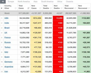 Україна у світовій статистиці 42-а за кількістю нових хворих, проте дев'ята за кількістю смертей серед хворих на Covid-19. Найбільше смертельних випадків у США, Росії та Польщі.