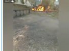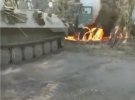 На кадрах видно, як охоплену вогнем бойову машину намагаються відбуксирувати з посадки, де трапилася надзвичайна подія. Очевидно, що кадри були зняті на смартфон одним з очевидців.