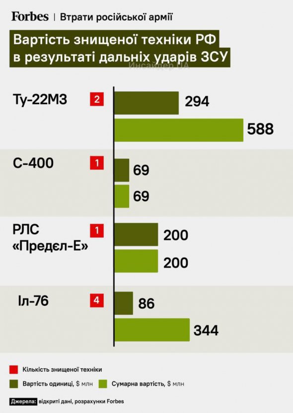 За два тижні Росія втратила два бомбардувальники Ту-22М3, чотири транспортні літаки Іл-76, пускову установку С-400 "Тріумф" і РЛС "Предел-Е", пише Forbes.