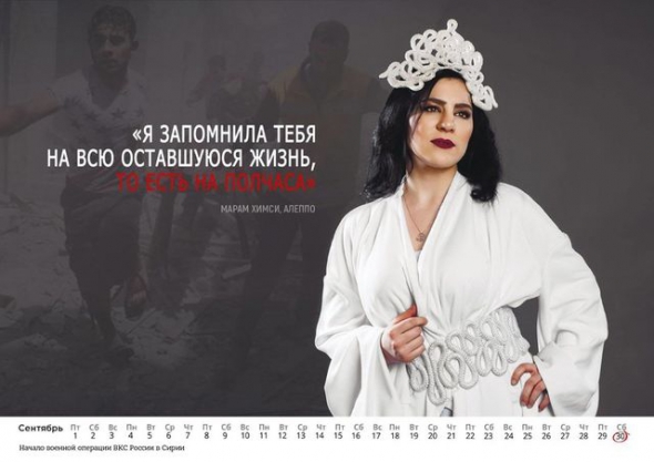 Пропагандистський календар з сирійськими красунями, що вихваляють чесноти російських чоловіків, з'явився у РФ перед Новим роком. Жінки вбрані у стилізовані кокошники. Фотографія супроводжується зверненням до російського воїна.
