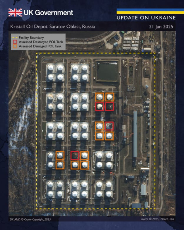 Було пошкоджено десять цистерн із паливно-мастильними матеріалами, ще чотири резервуари знищено. У соцмережі Х британська розвідка опублікувала супутниковий знімок наслідків.