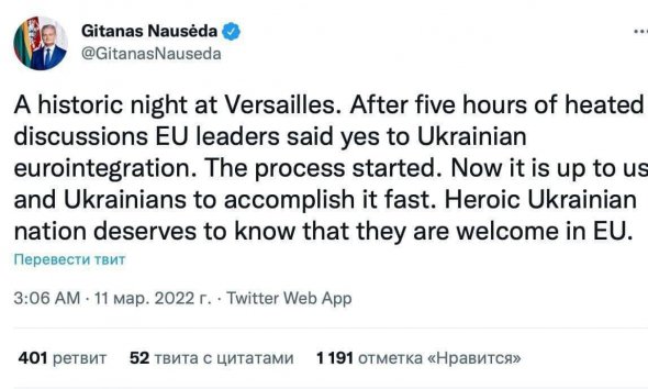 "Історична ніч у Версалі. Після п'яти годин гарячих дискусій лідери ЄС сказали "так" українській євроінтеграції. Процес почався. Тепер ми і українці повинні зробити це швидко. Героїчна українська нація заслуговує знати, що її раді в ЄС", - зазначив Науседа.