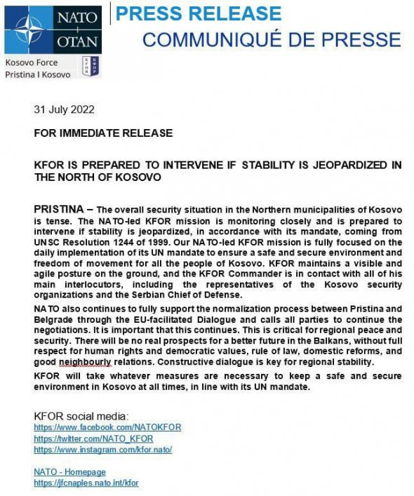 KFOR (Kosovo Force – Gazeta.ua) втрутиться, якщо стабільність Косова опиниться під загрозою, йдеться у пресрелізі.