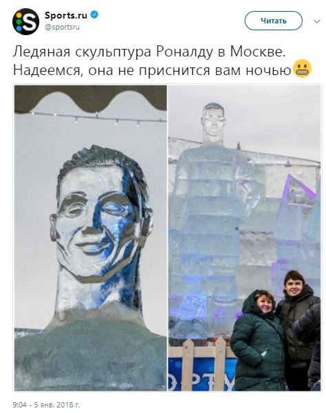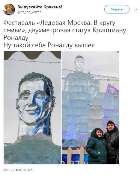 "А лід, як завжди, з лайна?", "Художник фанат ураганних хронік?", "Чому вони продовжують це робити з його обличчям?", "Крижана скульптура Роналду в Москві. Сподіваємося, вона не присниться вам вночі", - пишуть користувачі.