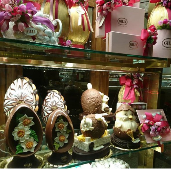 Святкові вітрини крамниць приваблюють кольоровими упаковками шоколадних пасхальних яєць. Саме таке, а не куряче, є символом свята італійців. Солодкими яйцями з сюрпризами всередині обмінюються серед близьких.