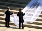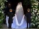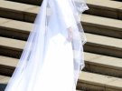 На весіллі Меган Маркл була одягнена в класичну шовкову сукню чисто білого кольору зі шлейфом п'ятиметрової довжини. Коштує $270 тис.