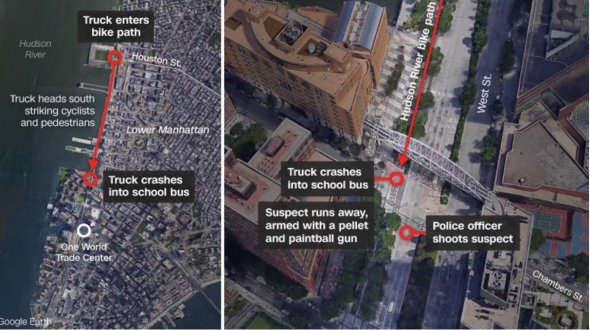 Близько 15:05 за місцевим часом чоловік виїхав вантажівкою на велосипедну доріжку вздовж шосе Вест-Сайд.
