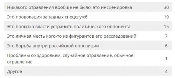 30% росіян проголосували, що отруєння Навального інсценували. 19% звинувачують західні спецслужби в провокації. Лише 15% опитаних вважають, що чинна влада намагалась прибрати конкурента.