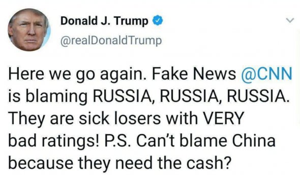 "Фейк ньюз CNN звинувачує Росію, Росію, Росію. Вони хворі лузери з дуже поганими рейтингами", – написав Трамп у Twitter.