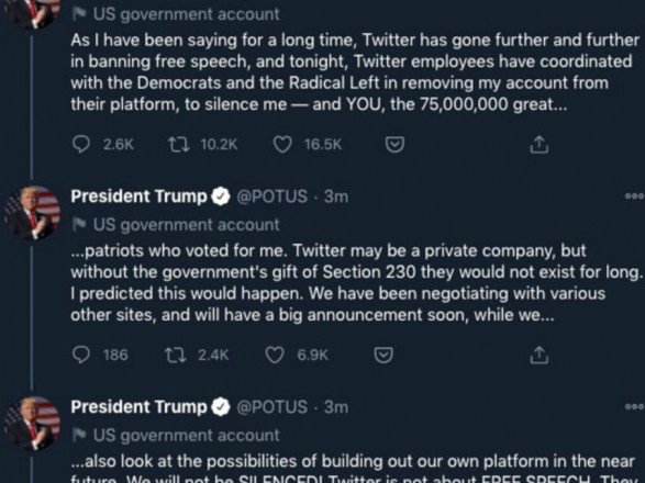 Він звинуватив Twitter в несвободі і пообіцяв, що не мовчатиме. Повідомлення з облікового запису @POTUS були практично відразу видалені.