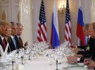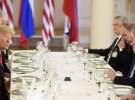 На опублікованих фото російські та американські делегації сидять за столом з білою скатертиною, склянками та порцеляною. Путін сидить навпроти Трампа. Главу Білого дому супроводжують держсекретар Майк Помпео та його перекладач. Також поруч посол США в Росії Джон Хантсман, начальник штабу Білого дому Джон Келлі; радник з питань національної безпеки Джон Болтон та експерт з російських питань і радник президента Фіона Хілл.
