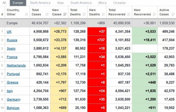 У Європі за приростом хвороби лідирують Велика Британія, Росія та Іспанія, свідчать дані Worldometers. Україна за кількістю нових заражень знаходиться на 69-му місці у світі. Поміж країн Європи вона на 13-му місці.