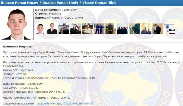 Як уточнили на сайті "Миротворець", Власов проходив військову службу у Військово-Морських силах Збройних сил України на території АР Крим і не прибув на континентальну територію України до зазначених пунктів збору. Перейшов на військову службу до окупантів.