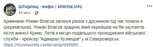 "Кримчанин Роман Власов загинув разом із дружиною під час пожежі в "Шереметьєво". Роман Власов - зрадник, який перейшов на бік окупантів після анексії Криму. Летів до місця подальшого проходження військової служби - крейсер "Адмірал Кузнєцов" у місті Сєвєроморськ", - написав він.