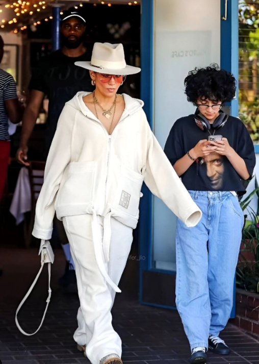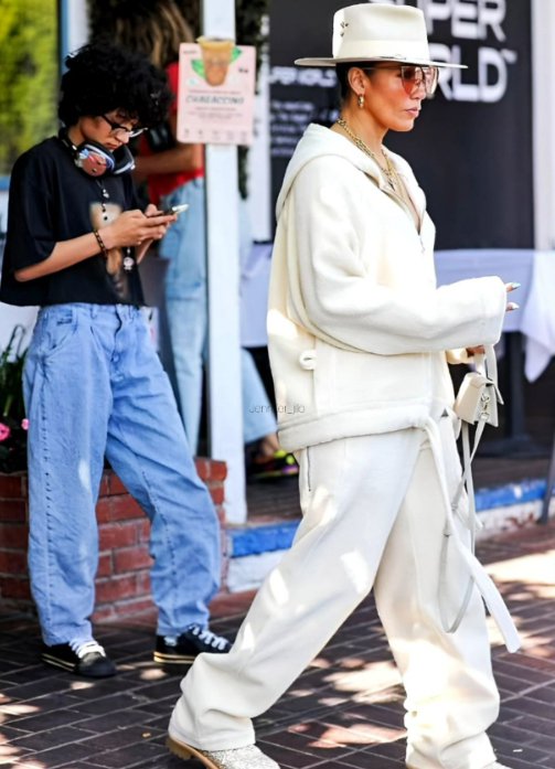 Для сімейного відпочинку Джей Ло вдягнула бежевий костюм оверсайз. Образ доповнила капелюхом, сонцезахисними окулярами, сумкою та золотими прикрасами.
