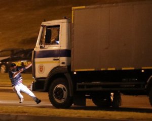 Один із протестувальників застрибнув на двері вантажівки. Тоді водій почав різко вивертати кермо в різні боки.
