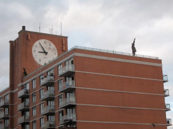 Житловий комплекс, на даху якого була встановлена скульптура, розташований на Манхеттені, в районі Іст-Віллідж і називаться "Червона площа".