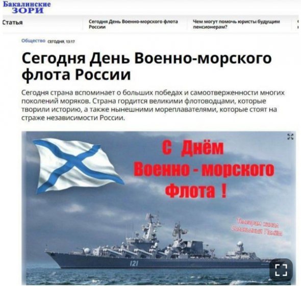 У Республіці Башкортостан місцеве видання "Бакалинские зори" привітало моряків картинкою з крейсером "Москва", який знищили українські військові. Зображення супроводжувало вітальний текст.