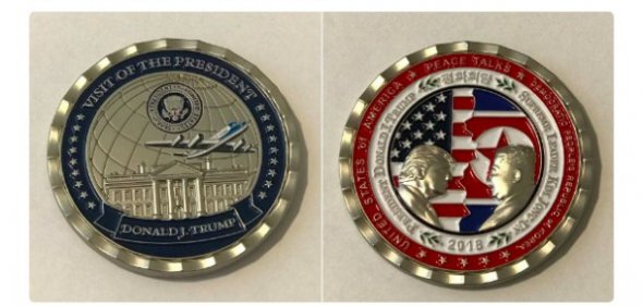 Відчеканило монету Військове управління Білого дому. На її аверсі в профіль зображені Дональд Трамп і Кім Чен Ин, а на тлі майоріють стяги США і КНДР. На реверсі розмістили Білий дім, борт номер один і зображення печатки президента США.