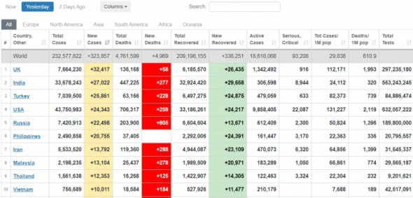 У Великій Британії зафіксували понад 32 тис. нових інфікованих за добу, в Індії – понад 27 тис., а в Туреччині – понад 25 тис. заражень. Далі за кількістю хворих у рейтингу перебувають США з більш як 24 тис. випадками інфікування та Росія – понад 22 тис. хворих.