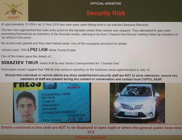 Як зазначається, 21 листопада камери відеоспостереження військової бази в графстві Беркшир зняли журналіста "Першого каналу" Тимура Сіразієва і оператора Дмитра Волкова. Вони перебували у районі штаб-квартири 77-ї бригади збройних сил Великобританії, що займається питаннями кібербезпеки і вели зі свого автомобіля відеозйомку.