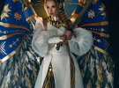 Символічне вбрання складалося з білої сукні й масивних золотих чобіт. Головною особливістю костюма стали німб із колосків пшениці, меч, а також величезні крила, що рухалися.