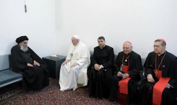 Сьогодні Папа Римський Франциск зустрівся з духовним лідером шиїтів - великим аятолою Алі аль-Сістані. Зустріч пройшла під час 1-го в історії католицької церкви візиту Папи до Іраку.
