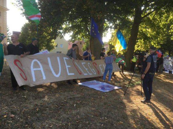 Активісти з Німеччини мітингують за звільнення українського режисера політв'язня Олега Сенцова. Акція відбувається в місті Гранзе. Там знаходиться палац Мезеберг - місце зустрічі російського президента Володимира Путіна та канцлера Німеччини Ангели Меркель