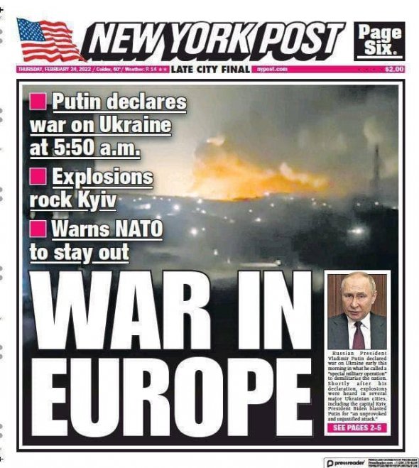У минулому огляді преси Gazeta.ua писала, що Росія розпочала війну проти України. Ракетні удари по всій країні. Бої на кордонах з Росією, Кримом та Білоруссю. Збути російські літаки та вертольоти. Країни Заходу засуджують агресію та готуються запроваджувати санкції.