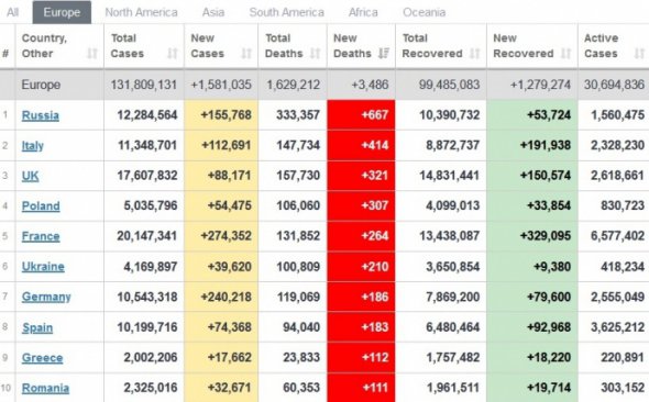 В Європі за добовим приростом хвороби лідирують Франція, Німеччина та Росія. За весь час пандемії вилікувались від недуги понад 307 млн осіб. Наразі нараховується понад 75 млн активних випадків захворювання. Від початку пандемії підтвердили понад 5,7 млн смертей.