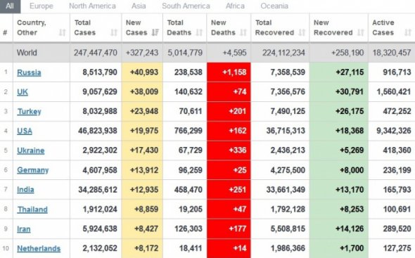 Україна на п'ятому місці світового рейтингу, свідчать дані Worldometers. Росія також лідирує за добовою Covid-смертністю. За приростом хвороби у Європі лідирують РФ, Британія та Україна.