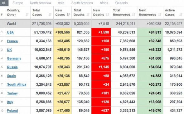 З початку пандемії підтвердили понад 5,3 млн летальних випадків хвороби. За добовою смертністю від Covid-19 у Європі лідирують РФ і Німеччина. Найбільше смертей за добу від коронавірусу у світі зафіксували в США - 1598.