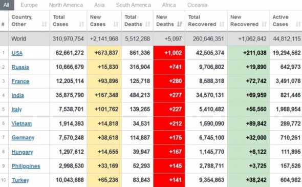 Станом на ранок вівторка у світі зафіксували понад 311 млн випадків зараження коронавірусом. Найбільше нових інфікувань виявили в США, Індії та Великій Британії.