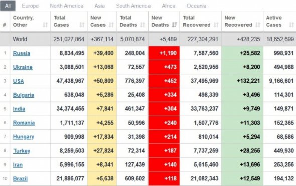 Зараз у світі нараховують понад 18 млн активних випадків захворювання. Вилікувались від недуги понад 227 млн осіб. З початку пандемії підтвердили понад 5 млн смертей від Covid-19.