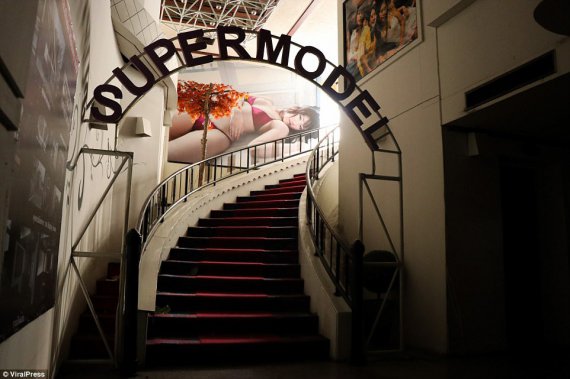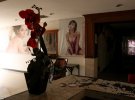 На фото видно спіральні сходи, що ведуть до приватних кімнат. Кожна з них оздоблена постером із жінкою у бікіні. Японське дерево прикрашає сходи, а поруч з джакузі досі лежать квіти.
