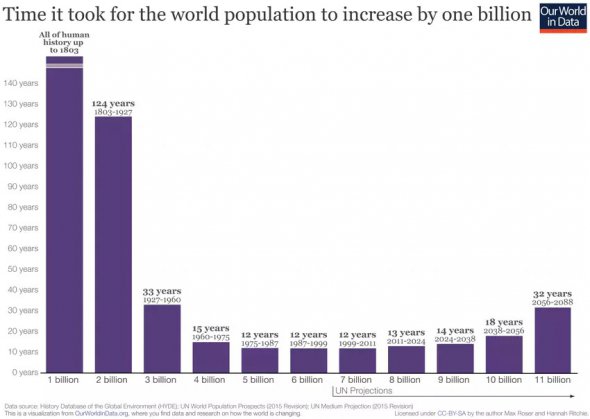 Була потрібна вся історія людства до 1803 року, щоб населення досягло 1 млрд. Наступний мільярд зайняв 124 роки, а наступний - ще 33 роки. Подальші мільярди були кожні приблизно 10 років. Але, схоже, людство досягає піку, і кожен майбутній мільярд досягатиметься дедалі довше.