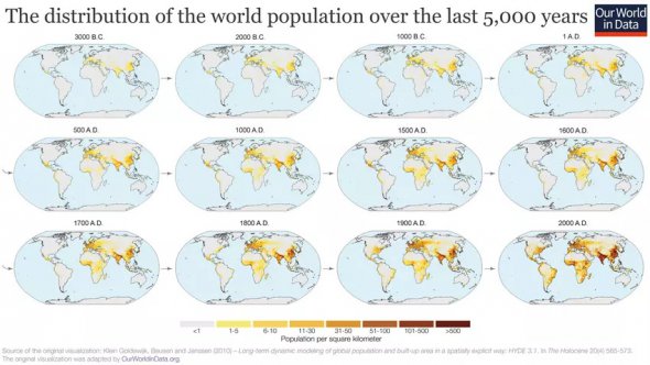 Станом на 3000 до н. е. людей можна було знайти переважно в Центральній Америці, Середземномор'ї, "Родючому півмісяці" й деяких частинах Індії, Японії і Китаю. Не випадково землеробство незалежно відкрили в багатьох частинах світу під час неолітичної революції.