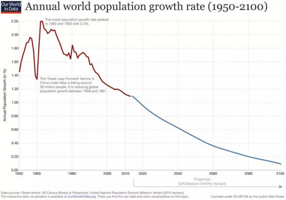 Через падіння коефіцієнта народжуваності, тобто кількості дітей на одну жінку впродовж її життя, темпи зростання населення світу за певний час уже знижувалися. Для відтворення чисельності населення на жінку має бути 2,1 дитини. Щоразу, як темпи зростання наближаються до нуля, крива населення стає все менш експоненціальною. Ріст вирівнюється, і за декілька десятиліть може замінитися спадом.