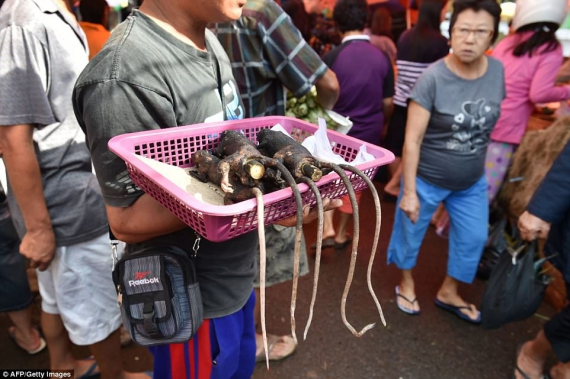 Смажених чорних чубатих макак продають разом з нарізаними пітонами, кажанами і собаками. Ці тварини захищені законодавством. Але торгівля процвітає. Місцеві турагенти пропонують гастрономічні тури.