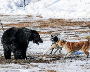 На всеросійському конкурсі собаки атакували прив'язану ведмедицю. Щорічний конкурс на північному сході Якутії проводять, щоб оцінити здатність собак утримувати небезпечну тварину.