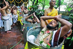 За стародавньою традицією, якщо мусонні дощі запізнюються, індійські священики — брахмани — сідають у бочки з водою, щоб провести ритуал викликання дощу. Вони одягають гірлянди з квітів. Співають молитви, в яких просять богів повернути на землю воду. Ритуал триває 4 год. У ньому беруть участь лише чоловіки. Жінки сидять вдома.