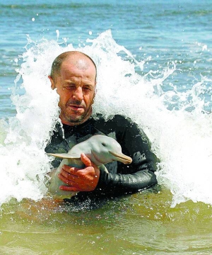 Директор природоохоронної організації "Сос Рескате" Річард Тезоре тримає 7-денну ла-платську дельфіниху в морі біля міста Піріаполіс, за 90 км від уругвайської столиці Монтевідео. Маля знайшли на пляжі Пунта-Колорада. У нього ще не відпала пуповина. Невідомо, чому дельфіненя відбилося від матері. Припускають, могло заплутатися в риболовецьких сітях.
