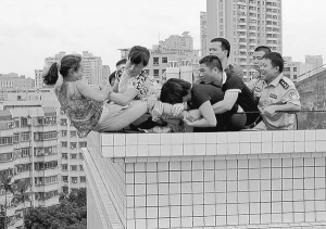 Рятувальники, родичі та друзі витягують китаянку Чен Фі, яка намагається накласти на себе руки, стрибнувши з 10-поверхового будинку в місті Чжанцзян, провінція Гуандун. Лише врятувавши її, вони дізналися про причини такого вчинку. Чен Фі розповіла, що посварилася із сестрою чоловіка. У нападі гніву задушила її 4-річного сина, свого племінника. Коли отямилася, скинула тіло дитини з даху й збиралася стрибнути вслід. Спочатку її вмовляли, а вона повільно, плачучи, перелазила через парапет. Тоді рятувальники кинулися до неї, вхопили за ноги й витягли.