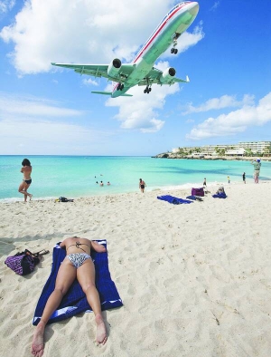 Літак "Американських авіаліній" іде на посадку над пляжем Махо, за яким починається посадкова смуга Міжнародного аеропорту принцеси Юліани на острові Сен-Мартен на Карибах. Лайнери, що знижуються тут, пролітають за 10-20 м над головами відпочивальників. Це привертає до пляжу увагу шукачів гострих відчуттів і так званих споттерів. Це ті, хто спостерігають за рухом різних повітряних суден та викладають в інтернет фото з бортовими номерами. Знак наприкінці пляжу попереджає: "Викиди реактивних двигунів можуть завдати фізичної шкоди, зокрема важкі тілесні рани та спричинити смерть!". Але це не відлякує охочих позувати на фоні пасажирського лайнера, до якого, здається, можна дотягтися.