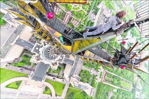Російський блогер 18-річний Віталій Раскалов стоїть на зірці головного шпиля Московського державного університету. Він із друзями захоплюється висотною фотографією міст. На дахи лазять без дозволів і страховки. "Хоч на шпиль веде окремий ліфт на кодовому замку, на виході чергує військовий, стоїть купа датчиків і камер, а під зіркою встановлено обладнання Збройних сил РФ та Управління державного зв'язку, ми проникли всередину і піднялися на самий верх", — пише Віталій.