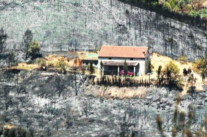 Будинок стоїть покинутий на лісистому схилі, що випалила пожежа у муніципалітеті Макастре поблизу іспанського міста Валенсія. Найбільша за останні 10 років пожежа триває в однойменній провінції з минулого четверга. Над Валенсією і передмістями висить та осідає хмара попелу. Із безпосередньої зони пожеж евакуювали близько 3 тис. людей.