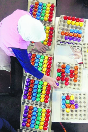 Працівниця фірми "Бехам" сортує писанки у німецькому князівстві Таннгаузен. Ця фірма є найбільшим виробником крашанок у Баварії. Перед католицьким Великоднем, який святкуватимуть 31 березня, тут фарбують по 200 тис. яєць щодня.