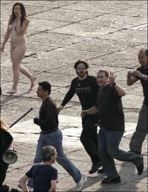 Люди слухняно вишикувалися на камінних плитах, які вкривають площу. Раптом одна із жінок не витримала й вибігла з натовпу. Швидко одяглася й пішла додому.